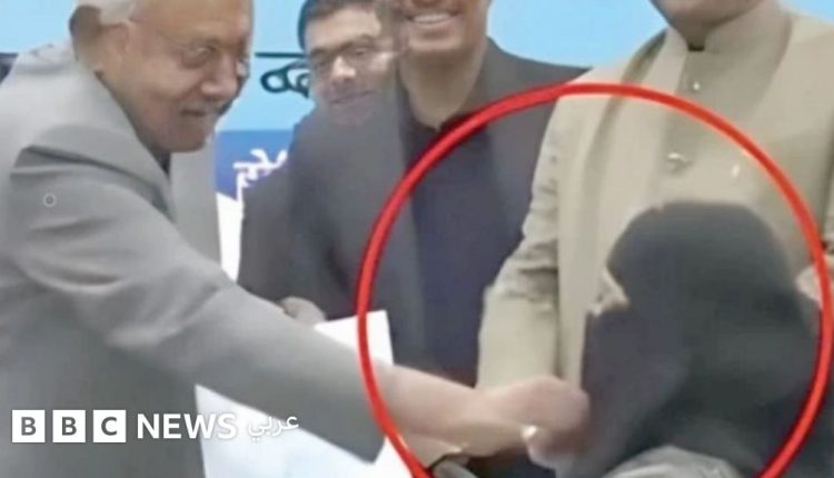 وأظهر الفيديو الذي انتشر انتشاراً واسعا المسؤول الهندي وهو يشير إلى الطبيبة نصرت بروين ويسألها عن غطاء وجهها قبل أن يمد يده وينزل النقاب ما أدى إلى كشف وجهها أمام الحضور.
