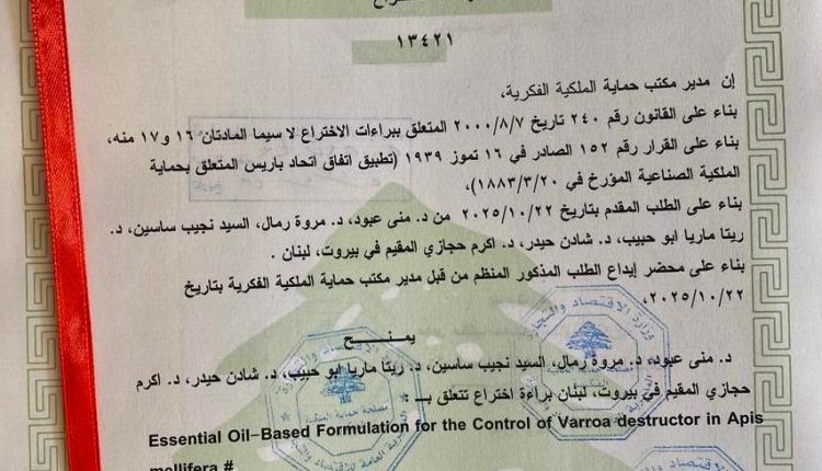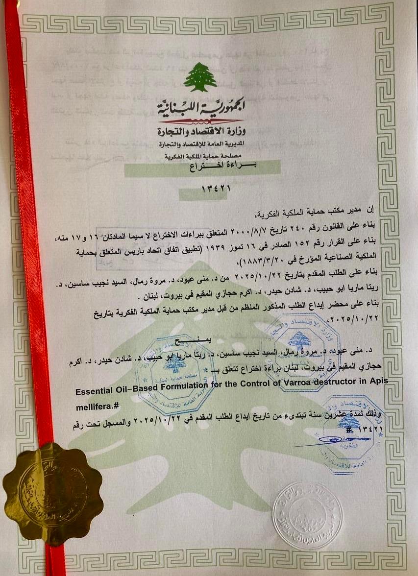 «تركيبة مستخلصة من الزيوت العطرية لمكافحة طفيل Essential Oil-Based) الفاروا في نحل العسل Formulation for the Control of Varroa destructor « (in Apis mellifera